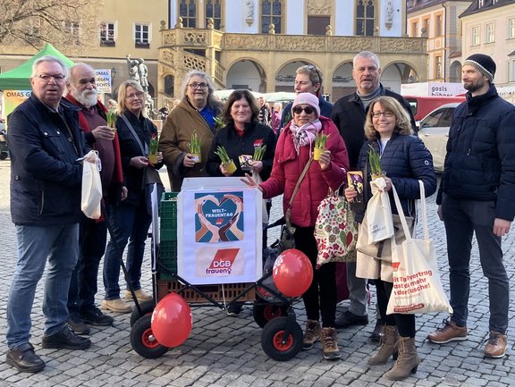 Am Samstag, 07.03.2026, trafen sich die DGB-Frauen aus dem Norden der Oberpfalz mit ihrer Sprecherin Petra Schilling und Regionssekretär Peter Hofmann zu einer gemeinsamen Aktion mit dem Bollerwagen am Marktplatz in Amberg.