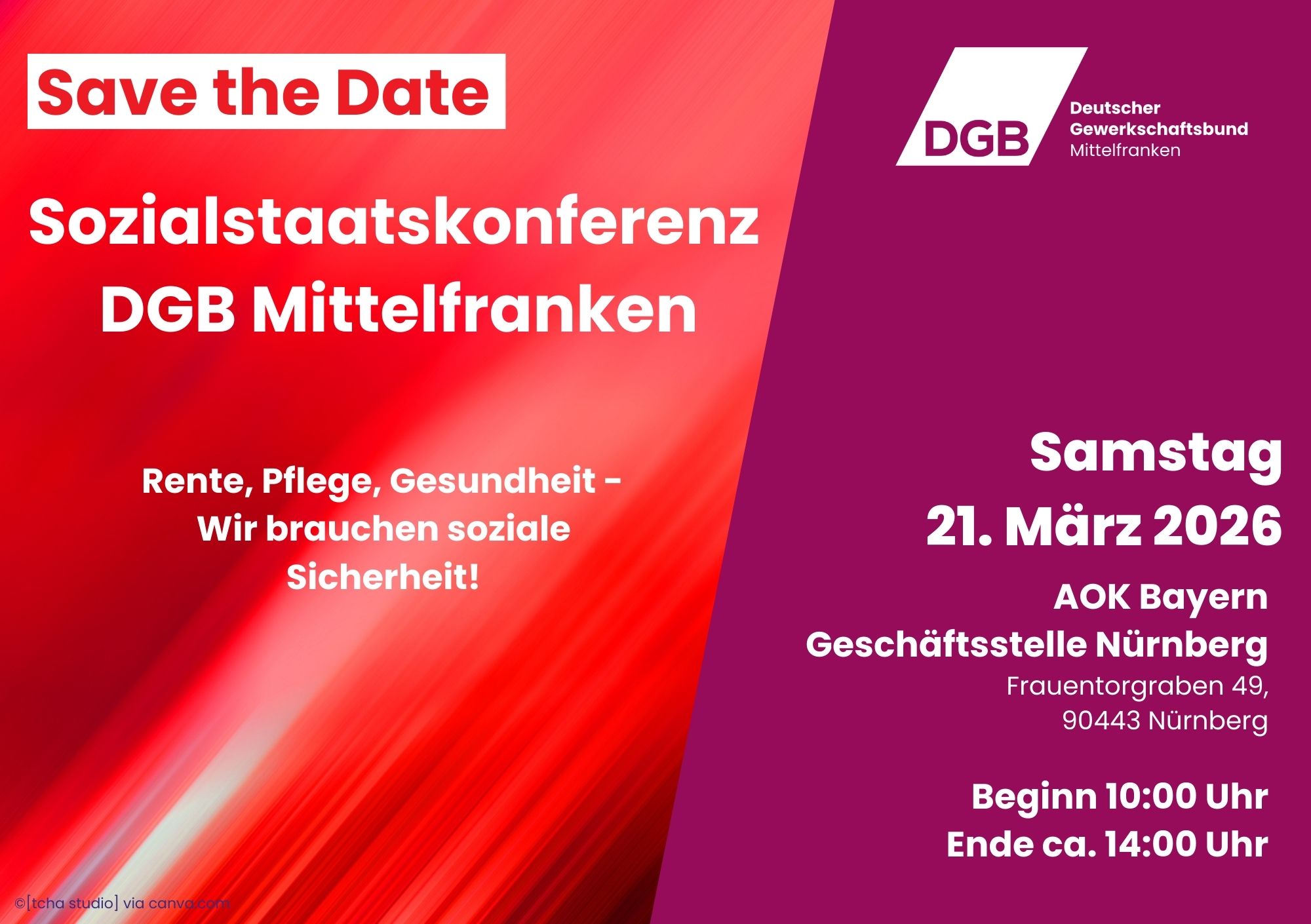 21. März 2026: Sozialstaatskonferenz des DGB Mittelfranken Rente, Pflege, Gesundheit - Wir brauchen soziale Sicherheit! in der AOK-Geschäftsstelle Nürnberg Download JPG