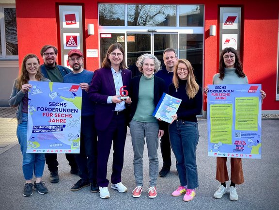 Wie bei den Gesprächen mit anderen OB‑Kandidat:innen übergab der DGB auch Helene Sigloch das Forderungspaket „Sechs Forderungen für sechs Jahre“, darunter: