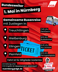 Bitte meldet euch per E-Mail unter nuernberg@dgb.de (mit Angabe eurer Gewerkschaft und des gewünschten Abfahrtsortes) an.